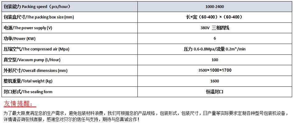 一、產(chǎn)品簡介 我廠作為專業(yè)的封碗封盒包裝機(jī)廠家,自動封盒包裝機(jī)是我廠2002年開發(fā)的產(chǎn)品,經(jīng)過十六年的研發(fā)與完善,該機(jī)能夠自動落盒,將塑料盒準(zhǔn)確落入模具中,自動打印生產(chǎn)日期及批號,自動抽真空包裝,或者抽真空后充入N2、02、CO2混合氣體。貝爾盒式包裝機(jī)以其成熟技術(shù),高端原裝進(jìn)口主機(jī)配件,高效使用性能,